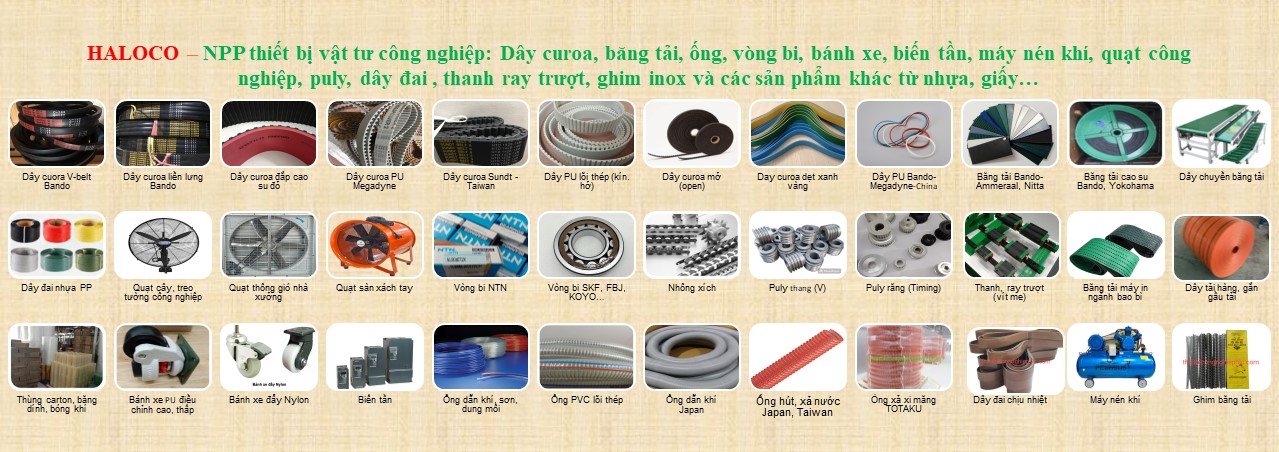 DANH MỤC SẢN PHẨM DÂY CUROA BĂNG TẢI, DÂY PU, ĐAI DẸT ỐNG CAO SU, PVC VÒNG BI, GỐI ĐỠ PULY, NHÔNG-XÍCH, DÂY TẢI BIẾN TẦN SHIHLIN MÁY NÉN KHÍ, QUẠT CÔNG NGHIỆP THANH-RAY TRƯỢT (VÍT ME) GIOĂNG CAO SU, KHỚP NỐI KHỚP NỐI INOX-NHỰA BÁNH XE, CON LĂN BĂNG TẢI NHỰA, THÙNG CARTON, BĂNG DÍNH, MÀNG PE, BÓNG KHÍ SẢN PHẨM NỔI BẬT DÂY CUROA BANDO BẢN A, B, C (Tiết kiệm điện) Liên hệ BĂNG TẢI PVC DÁN GỜ (T) Liên hệ ỐNG CAO SU XẢ XI MĂNG RỜI ID-100mm (Hãng TOTAKU) Liên hệ DÂY CUROA PU RĂNG (Thép kín-open) Liên hệ LIÊN HỆ VỚI CHÚNG TÔI QUA SỐ HOTLINE: 0983.885.231 – 0763.004.587 ĐỂ ĐẶT HÀNG DÂY CUROA DÂY CUROA BANDO BẢN A, B, C (Tiết kiệm điện) Liên hệ DÂY CUROA BANDO PJ, PK, PL Liên hệ DÂY CUROA 2 MẶT RĂNG Liên hệ DÂY CUROA BANDO 3V,5V,8V (Liền lưng) Liên hệ ỐNG CAO SU, PVC, PU ỐNG PVC DẪN KHÍ CO GIÃN (Hãng TOTAKU) Liên hệ ỐNG CAO SU XẢ XI MĂNG RỜI ID-100mm (Hãng TOTAKU) Liên hệ ỐNG NHỰA PVC SD-A 25mm (Hãng TOTAKU) Liên hệ ỐNG NHỰA PVC GÂN ĐỒNG (CO GIÃN) Liên hệ BĂNG TẢI BĂNG TẢI PVC DÁN GỜ (T) Liên hệ BĂNG TẢI PU-PVC (BANDO, NITTA…) Liên hệ BĂNG TẢI 2 MẶT NỈ (Dày 3-6mm) Liên hệ BĂNG TẢI BANDO CAO SU Liên hệ MÁY NÉN KHÍ, QUẠT CÔNG NGHIỆP MÁY NÉN KHÍ PEGASUS – 230L Liên hệ MÁY NÉN KHÍ PEGASUS – 330L Liên hệ QUẠT HÚT CÔNG NGHIỆP Liên hệ QUẠT PHUN XƯƠNG CÔNG NGHIỆP Liên hệ VÒNG BI, GỐI ĐỠ GỐI ĐỠ NTN Liên hệ VÒNG BI KOYO Liên hệ VÒNG BI NTN NJ206/NJ304 Liên hệ VÒNG BI INA Liên hệ BIẾN TẦN SHIHLIN BIẾN TẦN SHIHLIN SL3-043-2.2-KW Liên hệ BIẾN TẦN SHIHLIN SL3-021-0.75KW Liên hệ BIẾN TẦN SHIHLIN DÒNG SS2 Liên hệ BÁNH XE, CON LĂN BĂNG TẢI BÁNH XE CHỈNH MỨC ĐỘ Liên hệ BÁNH XE PU Liên hệ BÁNH XE CAO SU Liên hệ BÁNH XE CÀNG XOAY Liên hệ GIOĂNG CAO SU, KHỚP NỐI KHỚP NỐI NHANH ( INOX, ĐỒNG, NHỰA) Liên hệ DÂY GIOĂNG-RON NBR (Kháng dầu, chịu nhiệt) Liên hệ KHỚP NỐI-ỐNG DẪN KHÍ, SƠN HAKKO Liên hệ DÂY GIOĂNG-RON CAO SU (Kháng hoá chất) Liên hệ PULY, NHÔNG-XÍCH, DÂY TẢI PULY ĐAI THANG (V-BELT PULLEY) Liên hệ PULY ĐAI THANG (V-BELTS) Liên hệ NHÔNG GIGA, DBC Liên hệ NHÔNG XÍCH GIGA, DBC, KANA Liên hệ THANH-RAY TRƯỢT (VÍT ME) THANH, RAY TRƯỢT (VÍT ME) Liên hệ THANH, RAY TRƯỢT (VÍT ME) Liên hệ THANH, RAY TRƯỢT Liên hệ THANH, RAY TRƯỢT (VÍT ME) Liên hệ ĐỐI TÁC